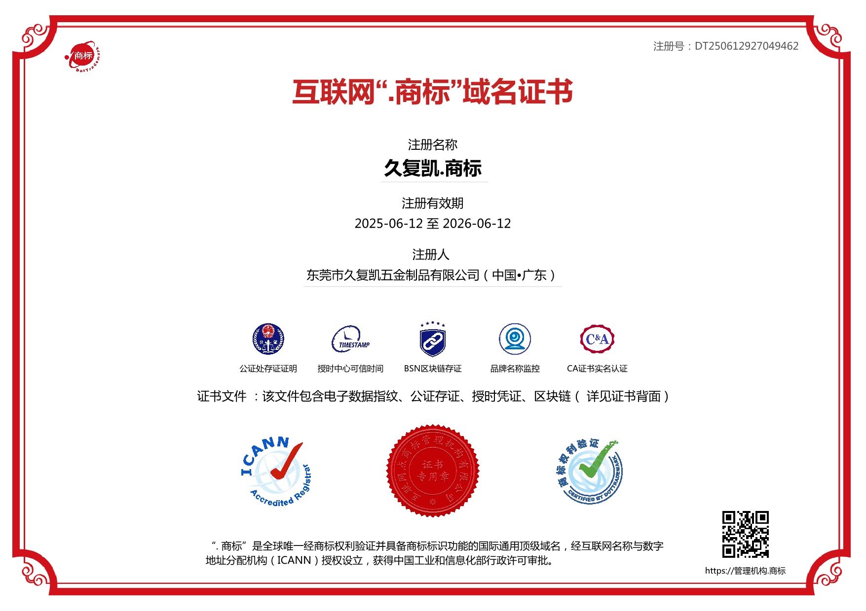 久复凯.商标_注册证书
